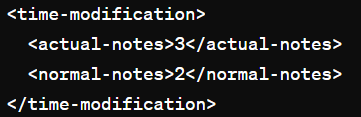- <time-modification>은 실제 연주시간과 악보상의 표시 사이의 관계를 정의하는 요소로, 셋잇단 음표같은 경우에 사용된다.
