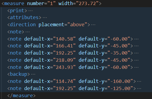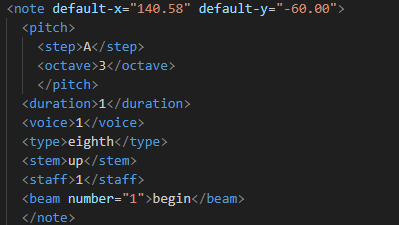 음표를 나타내는 <note>의 구성은 위와 같다. default-x,y 값은 구체적인 음표의 좌표값을 나타내는데, 세밀하게 직접 음표 위치를 지정하는 경우가 아니면 생략해도 되고, 생략시 프로그램의 알고리즘에 따라 자동으로 위치가 결정된다.