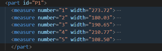 실제 음악 노트, 가사 등이 포함된 부분으로, 각 part는 고유한 ID로 part-list에 연결되어 있다. 위 사진에서 5개의 measure가 들어있음을 확인할 수 있는데, measure는 마디를 나타낸다. 5개의 마디로 구성된 악보이기 때문에 measure도 5개가 들어있는 것이다.