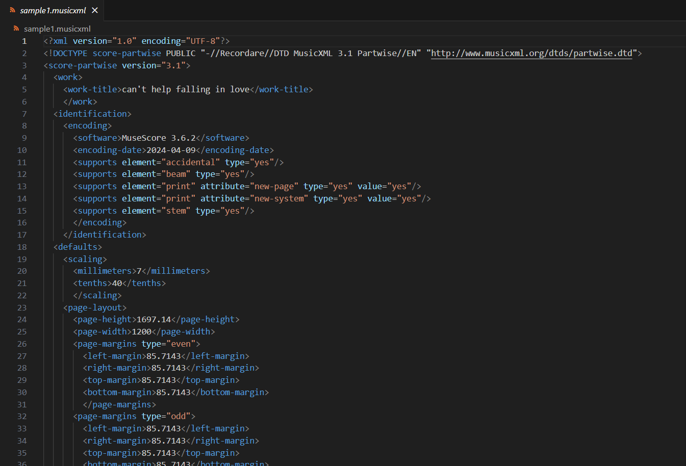 MusicXML은 이름에서 알 수 있듯이 XML을 기반으로 하는데, 음악 악보의 디지털 표현을 위한 표준 파일 포맷 중 하나이다. 줄글로 설명하는 것은 큰 의미가 없을 테니, 직접 MusicXML 형식의 파일을 제작해 보았다.
