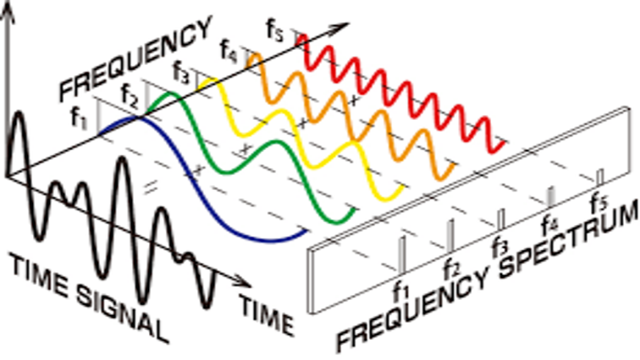 위 식은 푸리에 변환을 나타낸다. 푸리에 해석은 이 푸리에 변환을 이용해 함수를 해석하는 것이다. 관련 개념을 간단히 정리하면, 푸리에 급수(Fourier series)는 주기적인 신호를 sine파와 cos파의 합으로 표현하는 방법이고, 푸리에 변환(Fourier transform)은 푸리에 급수를 비주기적인 신호에 적용할 수 있도록 일반화한 것으로 이해할 수 있다. 이 푸리에 변환에 의해 time domain의 신호가 frequency domain으로 변환된다는 점이 중요하다. 이 frequency domain(주파수 영역)이라는게 와닿지 않을 수 있는데, 아래의 그림을 보면 이해가 쉽다.